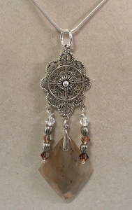 Montana agatized petrified wood festoon and earrings, enhanced with Swarovski crystals. On sterling silver filigree festoon. Earrings sun dial is silver-plated but the ear wires and head pins are sterling silver. Shipped with 18-inch sterling silver chain unless another length is requested. Chains available in 16-inch to 36-inch lengths.