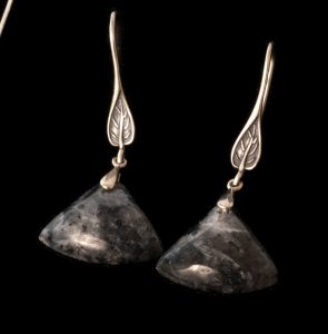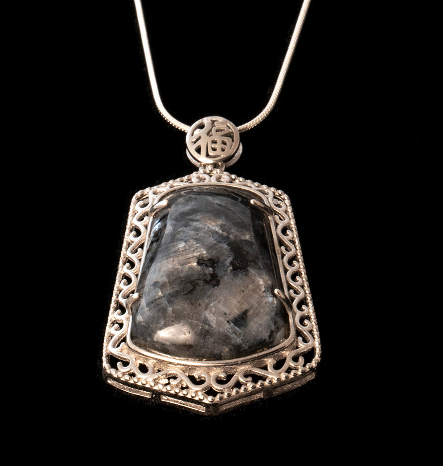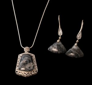 Larvikite sterling silver pendant and sterling silver earrings. Pendant measure 2 1/2″ long and 1 1/4″ wide on bottom. Shipped with 20-inch sterling silver chain unless another length is requested. Chains available in 16-inch to 36-inch lengths.