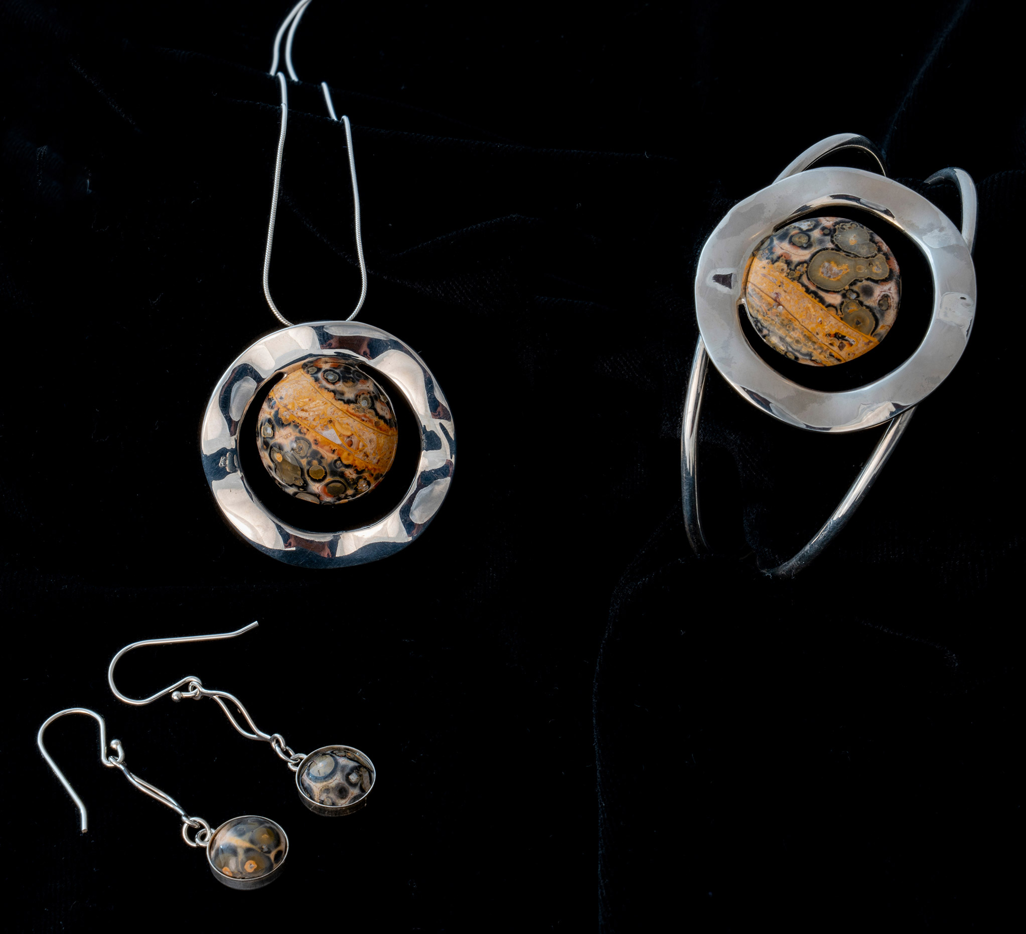 Leopardskin Jasper in solid sterling silver wavy pendant, bracelet and earrings.