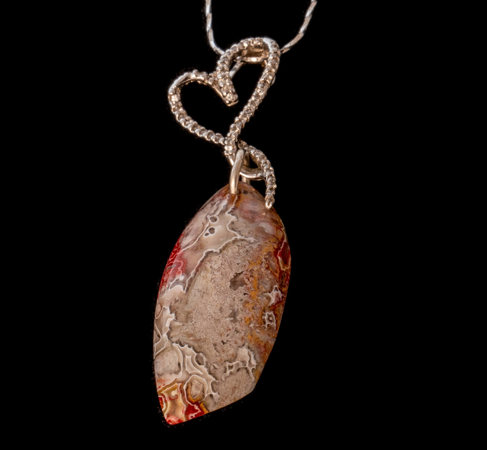 Mexican Crazy Lace Agate on sterling silver heart bail and chain. Matching earrings on sterling silver link and earrings. Shipped with 20-inch sterling silver chain unless another length is requested. Chains available in 16-inch to 36-inch lengths.