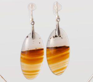 Montana Moss Agate pendant featuring a gold color with numerous black tubes. Pendant is stainless steel with a sterling silver chain. Earrings are swirls of gold/orange/brown and clear with tiny black dendrites on sterling earrings. Pendant shipped with 20-inch sterling silver chain unless another length is requested. Chains available in 16-inch to 36-inch lengths.