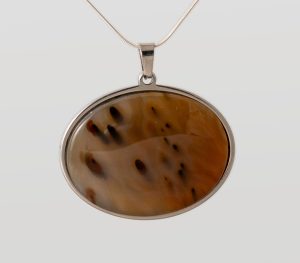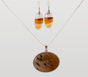 Montana Moss Agate pendant featuring a gold color with numerous black tubes. Pendant is stainless steel with a sterling silver chain. Earrings are swirls of gold/orange/brown and clear with tiny black dendrites on sterling earrings. Pendant shipped with 20-inch sterling silver chain unless another length is requested. Chains available in 16-inch to 36-inch lengths.