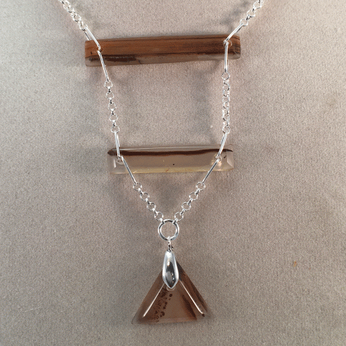 Delicate sterling silver necklace highlight this orange Montana Moss Agate with black dendrites. Matching earrings available, product number 7338. Shipped with 20-inch sterling silver chain unless another length is request. Chains available in16-inch to 30-inch lengths.
