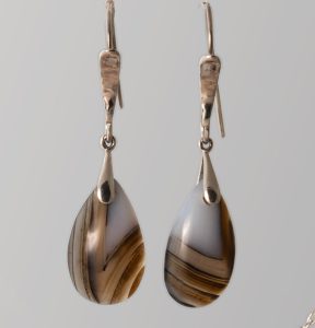 Gorgeous Montana Moss Agate of circles of brown and black with center chalcedony in the center hole on sterling silver festoon. Perfectly matched earrings on sterling silver earrings. Pendant is approximately 2″ long and 1 1/4″ wide. Festoon has an 18″