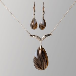 Gorgeous Montana Moss Agate of circles of brown and black with center chalcedony in the center hole on sterling silver festoon. Perfectly matched earrings on sterling silver earrings. Pendant is approximately 2″ long and 1 1/4″ wide. Festoon has an 18″