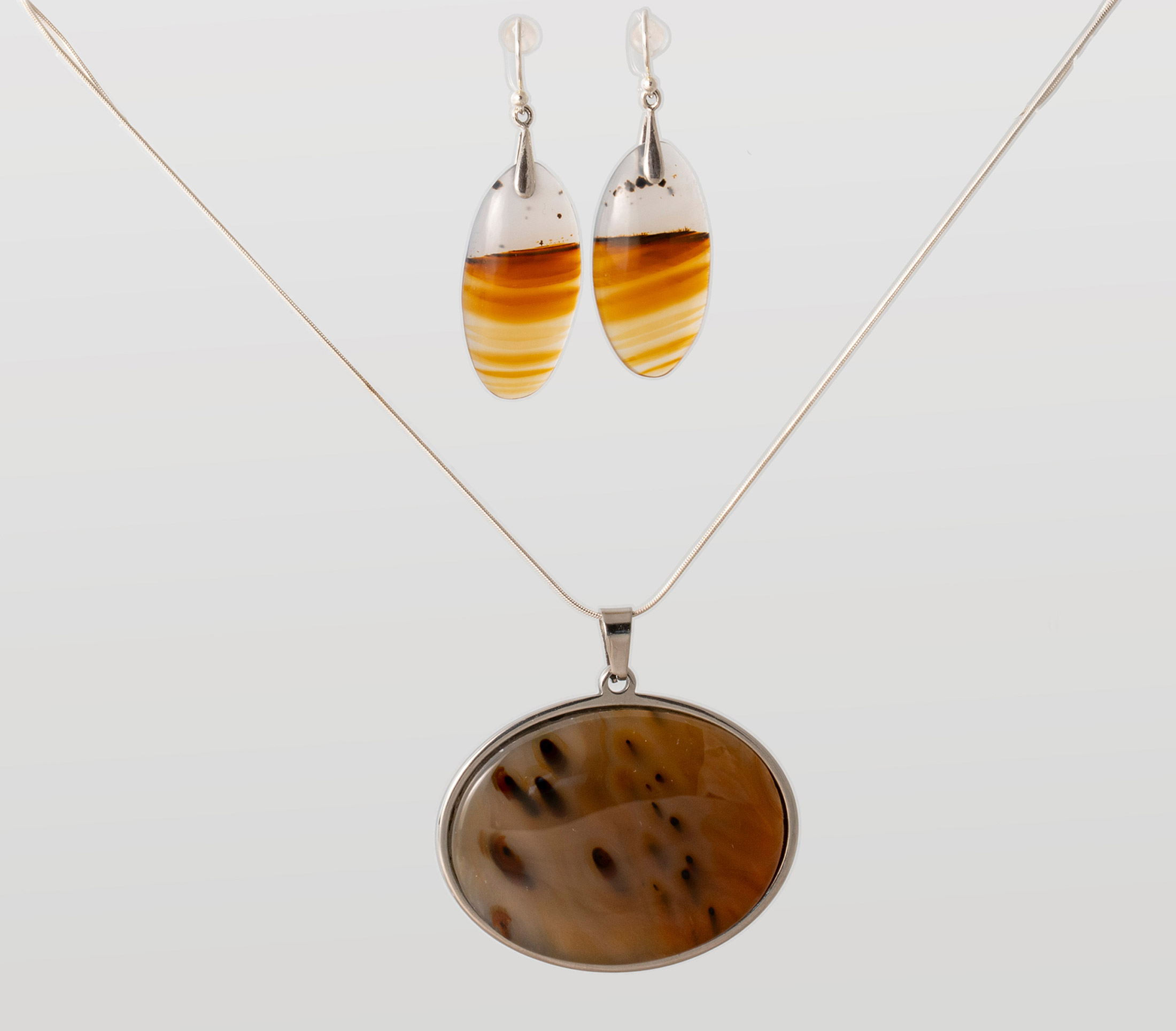 Montana Moss Agate pendant featuring a gold color with numerous black tubes. Pendant is stainless steel with a sterling silver chain. Earrings are swirls of gold/orange/brown and clear with tiny black dendrites on sterling earrings. Pendant shipped with 20-inch sterling silver chain unless another length is requested. Chains available in 16-inch to 36-inch lengths.