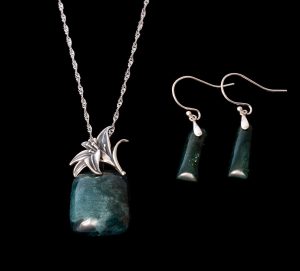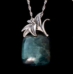 Ocean Jasper Pendant on sterling silver lily bail and chain. Matching earrings on sterling silver earrings. Pendant measure approximately 1 3/4″ long and 1 1/4″ wide. Shipped with 20-inch sterling silver chain unless another length is requested. Chains available in 16-inch to 36-inch lengths.